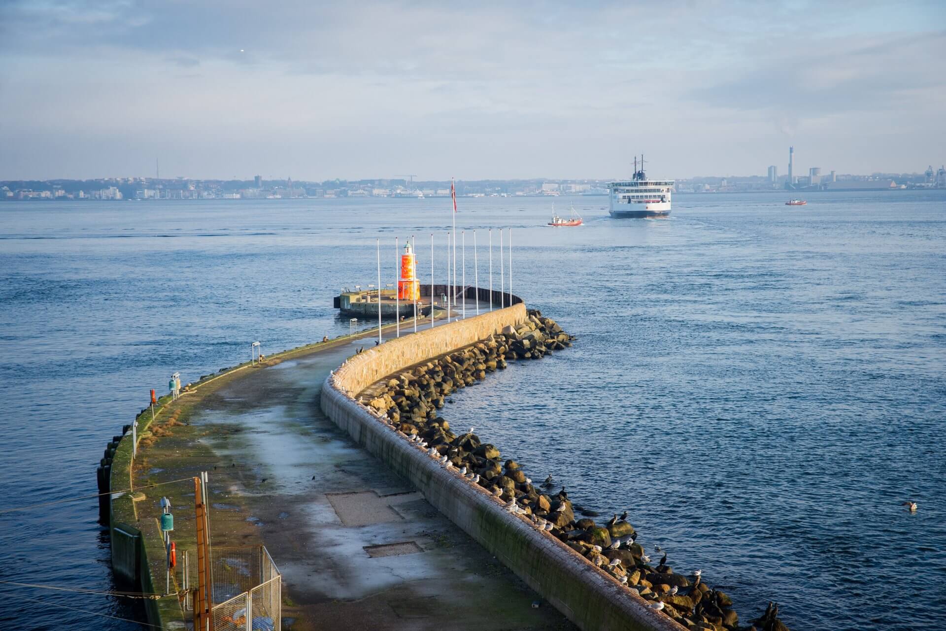 Vi kører fra Jylland og over Fyn og Sjælland til Helsingør, hvor vi tager færgen til Helsingborg.